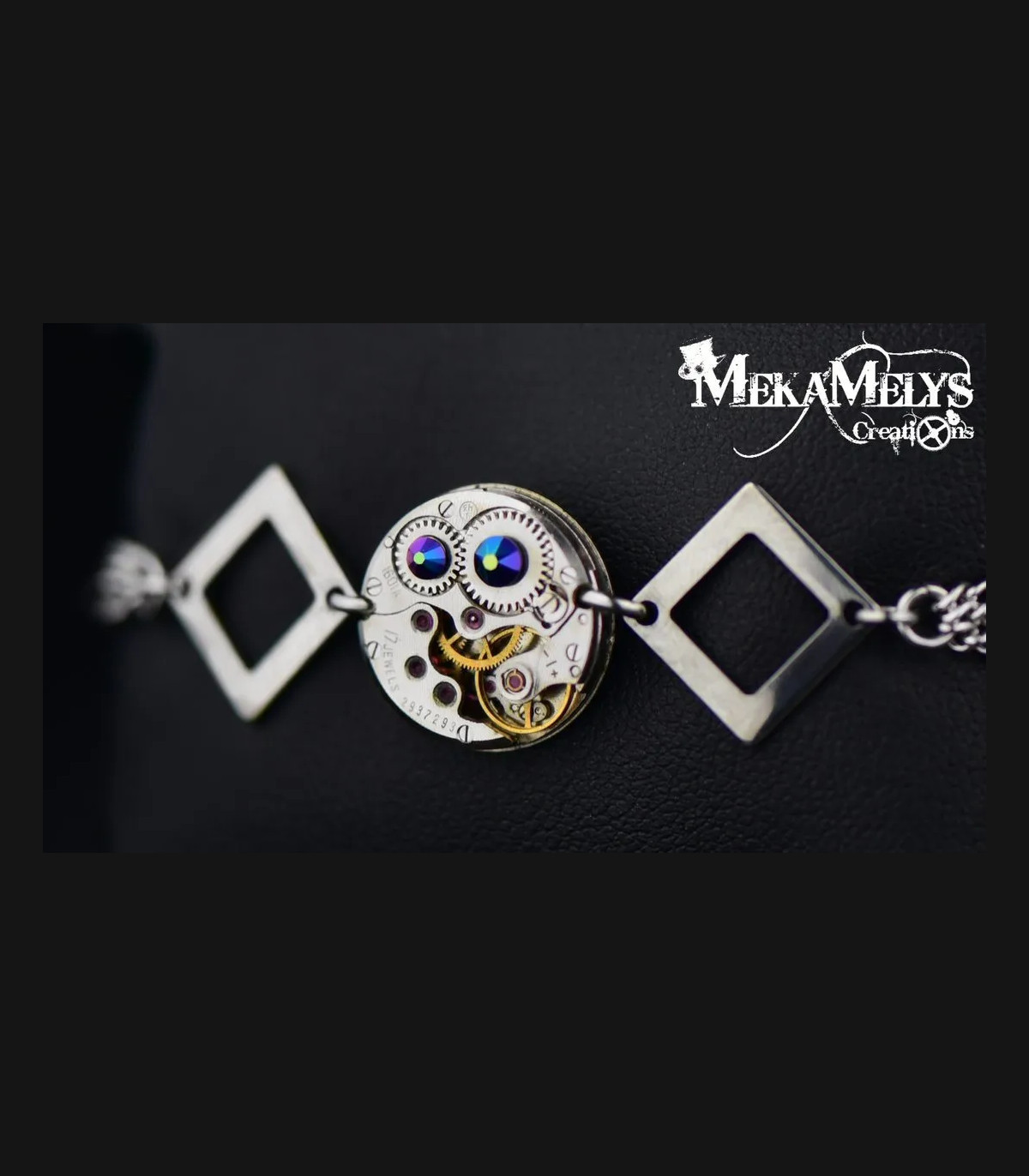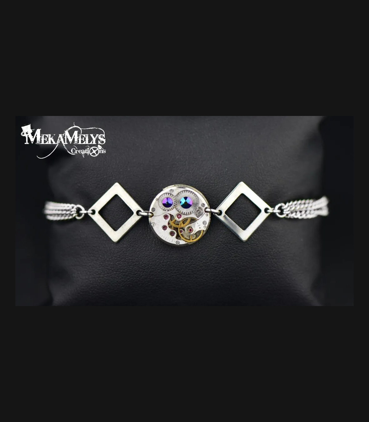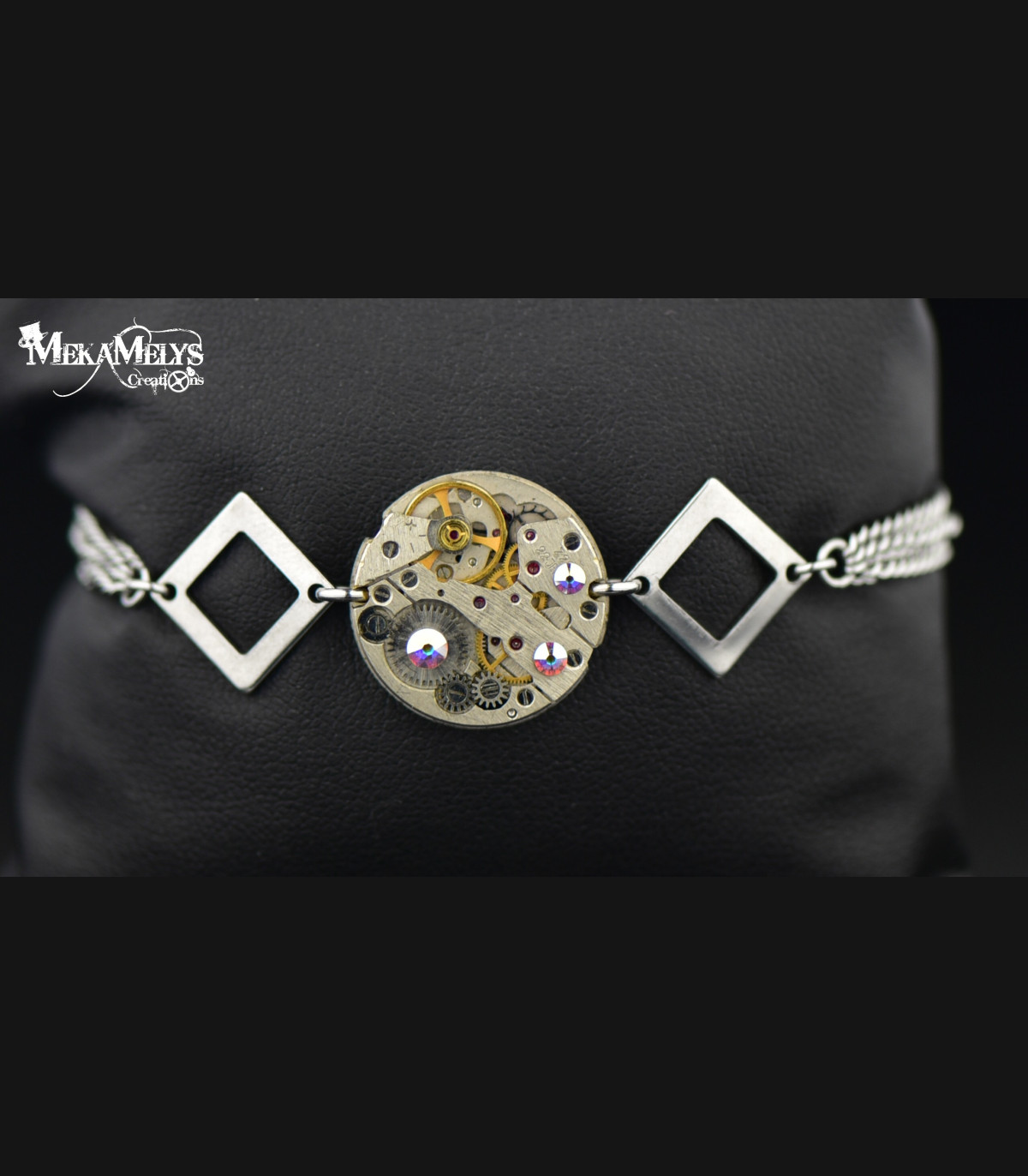 Bracelet avec un mécanisme de montre de 2 cm, avec des intercalaires losanges et des chaînes en acier inoxydable, orné de cristaux Swarovski® de couleur Crystal aux reflets irisés roses.
