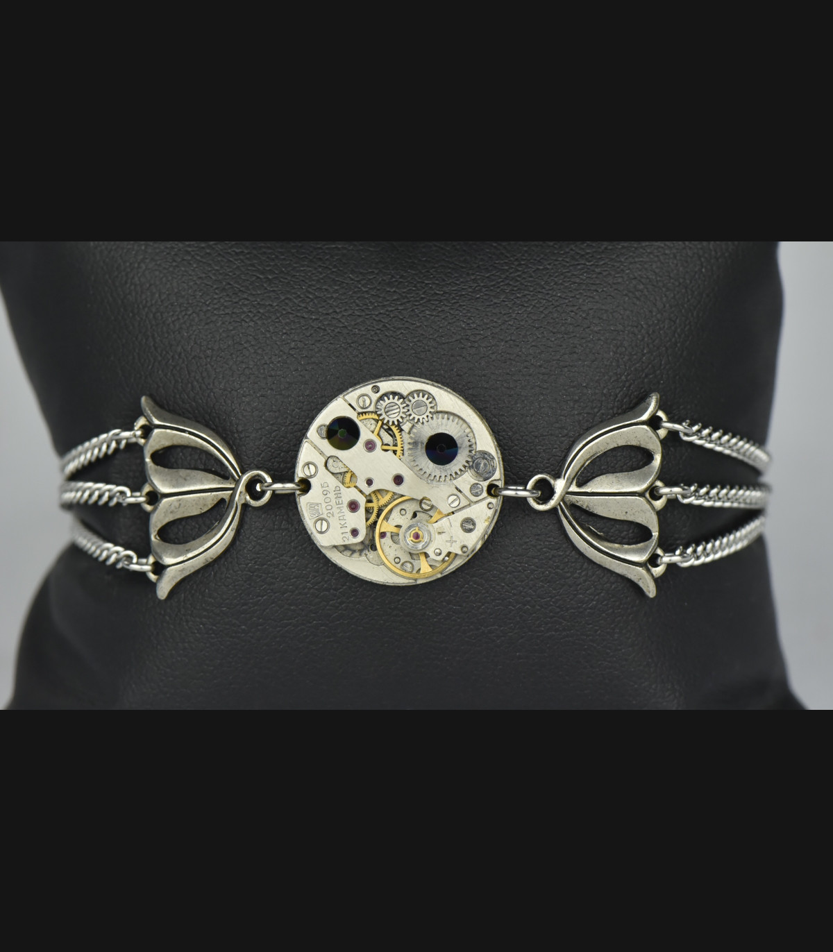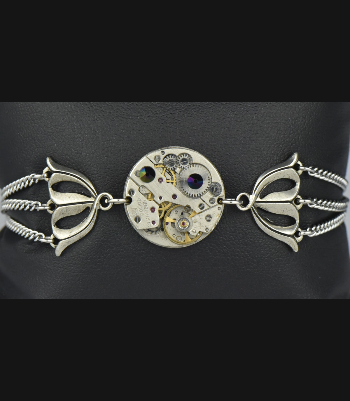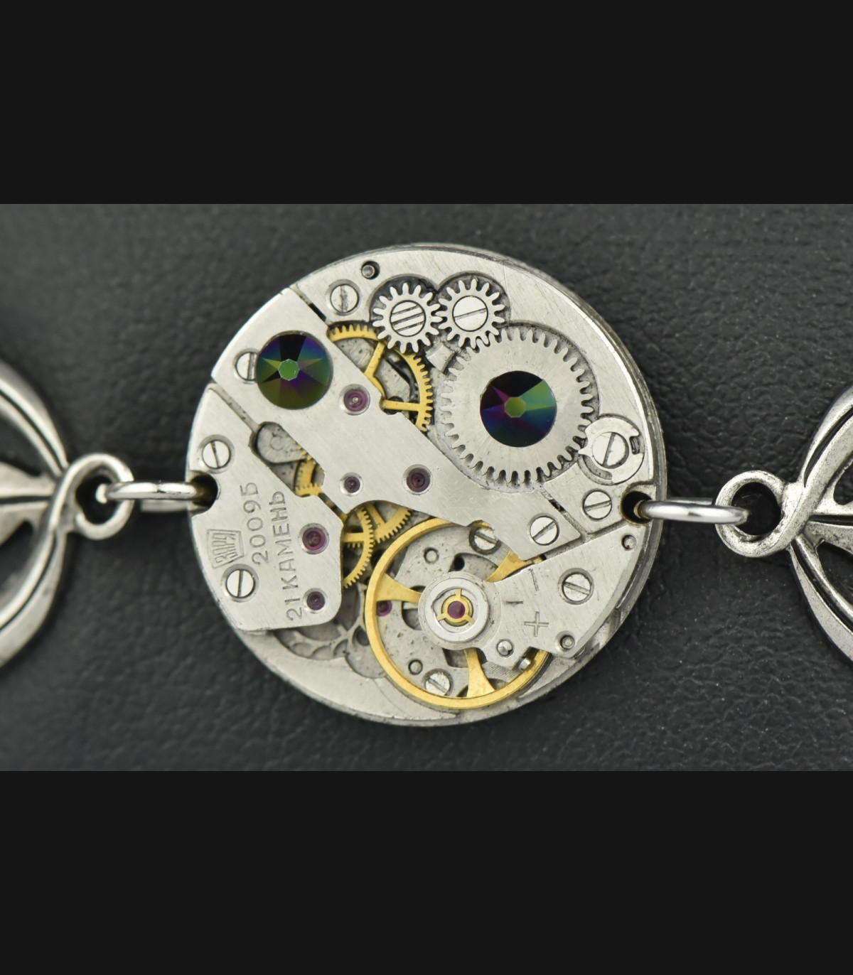 Bracelet avec mécanisme de montre de 20mm, rubis d'horlogerie et strass Swarovski® de couleur noir avec des reflets violet vert ornée d’estampe en laiton galvanisé argenté vieilli.