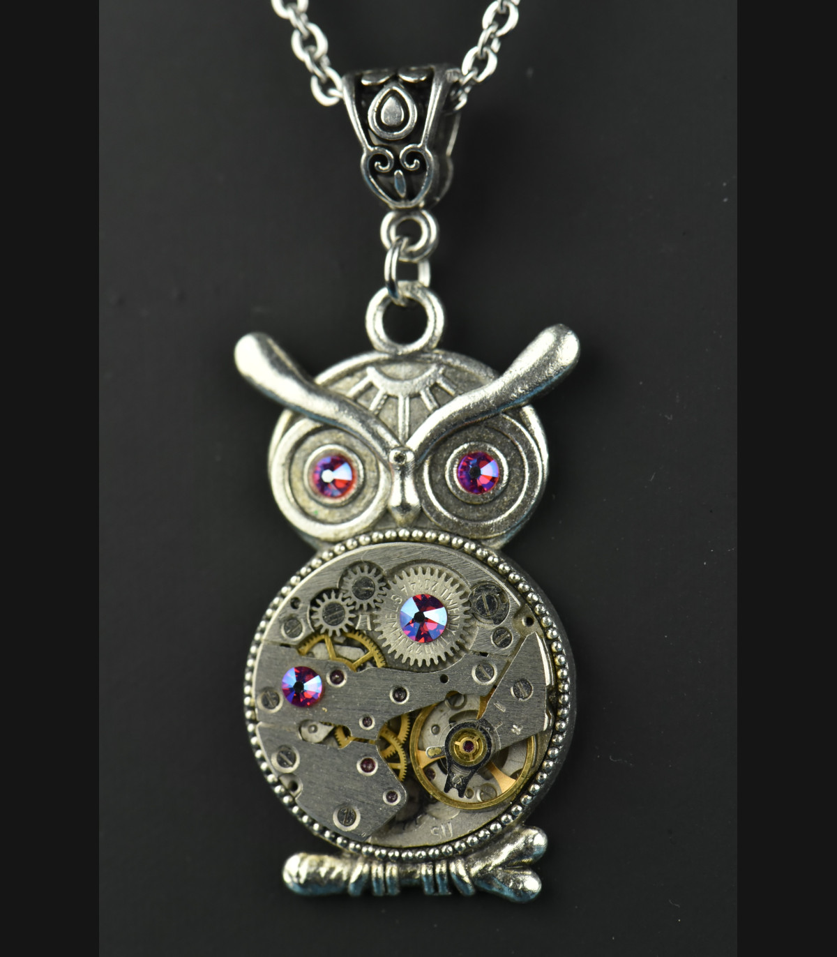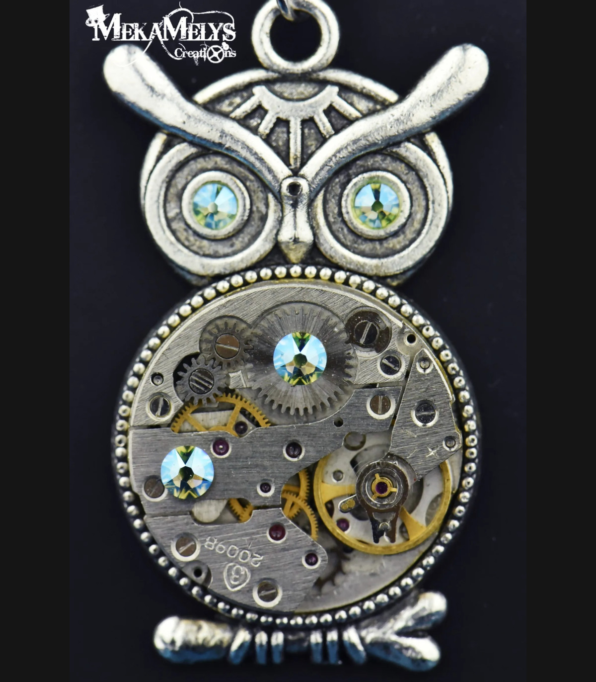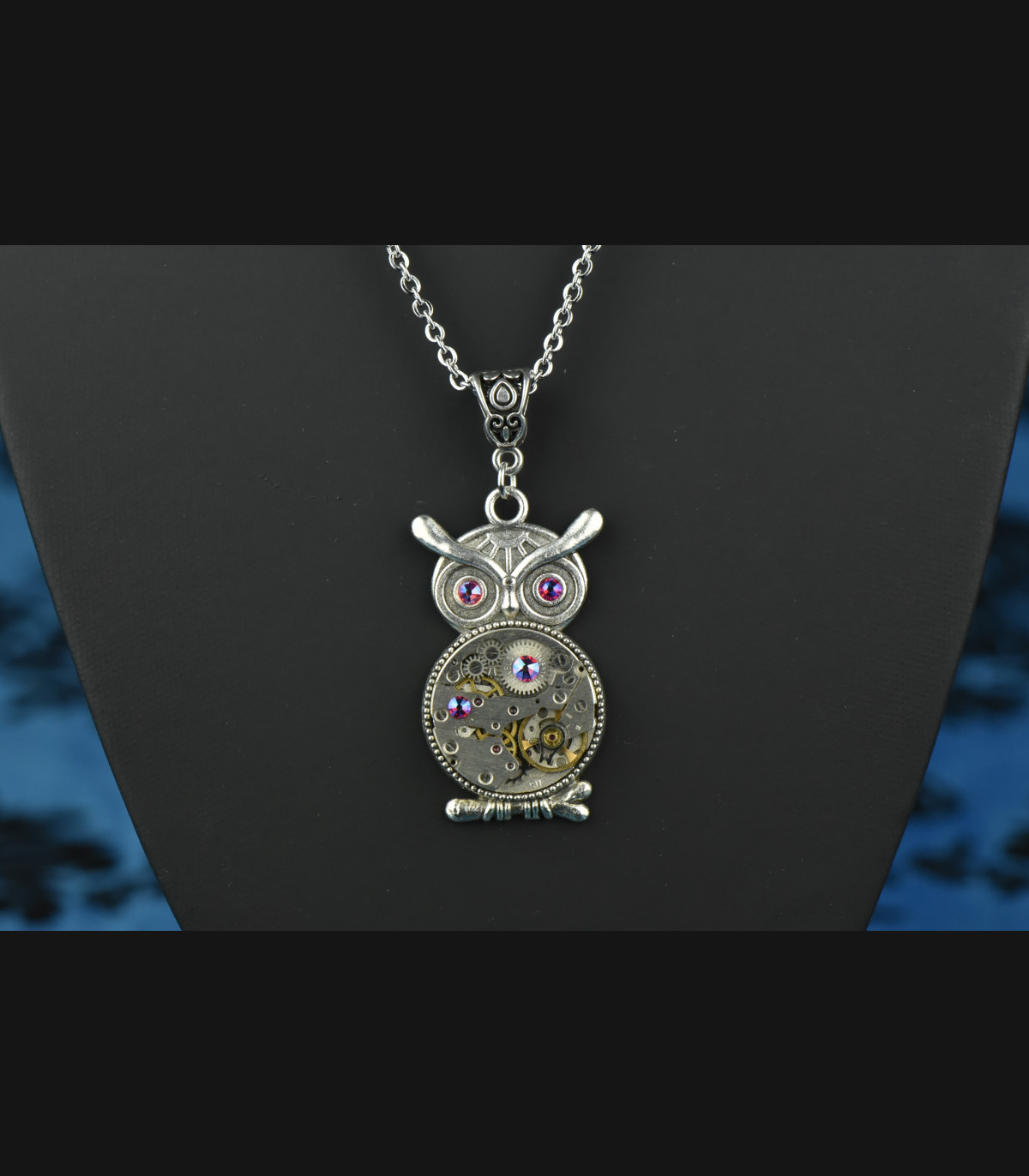 Collier avec un pendentif en forme de petit hibou en alliage de zinc sans nickel, monté avec un mécanisme de montre de 20 mm et des strass Swarovski® de couleur orange foncé aux reflets irisés bleus.