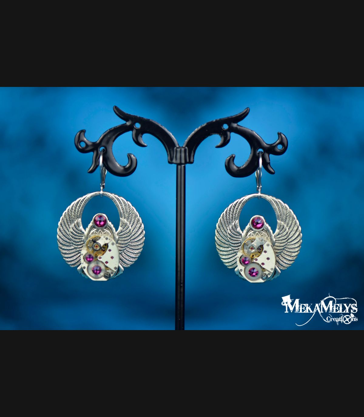 Apportez une touche d’originalité à votre style avec ces boucles d’oreilles steampunk uniques, ornées de véritables mécanismes de montres anciennes de 13 x 16 mm. Chaque pièce est délicatement agrémentée de strass Swarovski® Bleu métallique, posés sur des estampes en forme de scarabée au design Art Déco, pour un rendu à la fois élégant et audacieux.